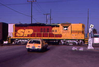 A scene that can never be repeated as the SP 3370 crosses Civic Center Blvd in Santa Ana in 1987.