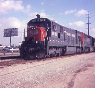 Merger painted for the SPSF merger that never took place, SP GP-9E 3370 comes through the three track yard at Washington Street in Santa Ana. These tracks were removed during the Interstate 5 widening project.