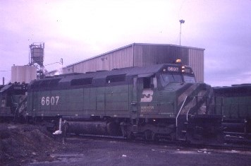 Burlington Northern F45 6607, nee Great Northern 434 (Big Sky Blue paint), built by Electro-Motive Division in 1969. Retired in 1984, it was leased to Helm Helm for use on the Utah Railway, retaining its number and was then scrapped.