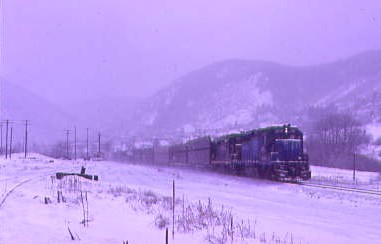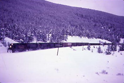 We caught Rio Grande 5351 East with four Missouri Pacific SD40-2's in the consist then further northwest, crossed the summit of Tennessee Pass and started our descent. Bill decided to switch gears then we hit an ice patch and spun out into a snow bank. As we were trying to work out how to remove the vehicle, a Denver and Rio Grande Western signal maintainer drove up and offered to pull us out using the wrench on his truck. He freed us with no problem and after thanking him, we proceeded to Minturn, checking in at the railroad's offices to learn there was an eastbound on its way, so started off in search of the train.