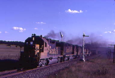 We made our way to Trinidad where we found Burlington Northern 7177 East about to leave. Continuing southeast along this line on local roads, we entered New Mexico and at Des Moines, joined US 87, which we followed to Dalhart, Texas.