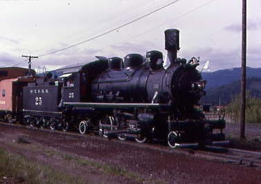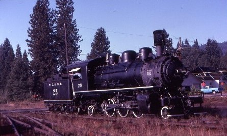 Jeff and I walked down to the engine house and found McCloud River Railroad 2-6-2 25, built by American Locmotive Company in 1925, slowly reversing out into the clear morning sun with only a few clouds hanging over the mountain in the distance. After leading the 1955 Gold Spike Excursion marking completing the Burney extension, it was retired and stored until the early 1960's when it was restored for passenger excursions that lasted from 1962-1975, 1982-1986, 1997-2001 and a few trips in 2008. Between 1988 and 1997, it was leased to Great Western Railway Museum then re-acquired by McCloud River Railroad before being sold to the Oregon Coast Scenic Railroad.