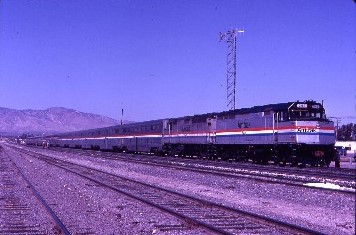We made great time through here and all too soon, we were curving on the high viaduct off the freeway to reach the mainline at El Monte then crossed the San Gabriel River before passing the north side of SP's City of Industry Yard and proceeded east on the Sunset Route through Walnut to Pomona, where we stopped briefly to pick up some more passengers. Now in the San Bernardino Valley, we cruised through Montclair and Ontario, by the airport and through Kaiser Yard which served the large Kaiser Steel plant north of the freeway. We paralleled Interstate 10 to West Colton Yard, where we were routed around the south side so everyone had an opportunity to see the yard, stopping long enough to add an SD40E to the point of our train as a helper. We passed the fuelling racks and the outbound yard before we made our way to the maze of switches to reach the Palmdale Cutoff.