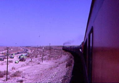 Extra 4449 West crossed the Highline Canal then descended to Niland, where the paved highway returned and the train chasers waited. The train steamed on through and the races began between the drivers, each trying to beat each other to another photo location ahead of the train. Impeding their efforts were those people who felt they must pace the engine and watch the steam engine's drivers rotating. Added to all of that madness were the innocent drivers coming the other way and not knowing we were coming. As we approached Wister and from my vantage point in the vestibule, I saw many traffic laws being broken and the whole circus was highly entertaining. While riding behind any steam engine is most enjoyable and fun, watching the people on the ground is also fun.