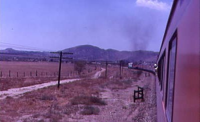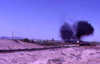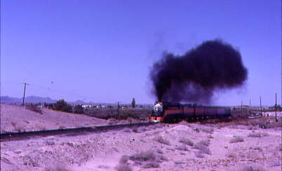 Extra 4449 West made an unexplained stop on this single tracked railroad and I went to an open vestibule to find we were stopped at a red signal. However, it was not the regular searchlight type, but instead an upper quadrant semaphore, a strange sight indeed to see a steam train semaphore signal in the 1980's. It turned out that we had to stop due to the red signal and after a call to the dispatcher from our engineer, we were allowed to continue on our journey. The train's route had been following the Salt River down its valley to the west with the sidings of Dixie, Arlington, Gillespie, Saddle, Hyder and Kofa and we passed each of them with no more delays. We were out in true Sonoran Desert with little traces of man except for the two ribbons of steel upon which our train was riding.