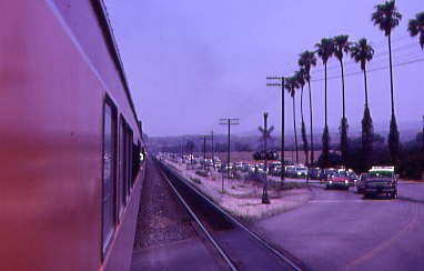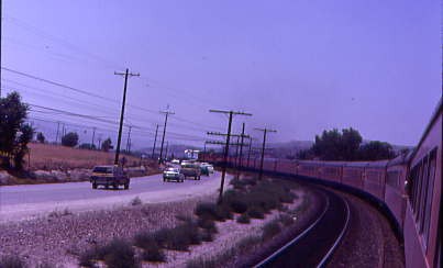 The train departed on time and our group took over the Sightseer Lounge car. I enjoyed an evening of drinking and sharing railroad stories with my newly-found friends as we travelled via the Alhambra trench, much to everyone's liking. Conversations were briefly halted at Pomona when we saw the deplorable condition of the station building there, but returned to high spirits as we continued east through Southern Pacific's West Colton Yard and then interests turned to the train's passage by Colton Tower. We twisted and turned to climb up San Timoteo Canyon where we met three opposing freight trains, then as the Sunset Limited crested the grade at Apex, I returned to my seat and fell asleep.