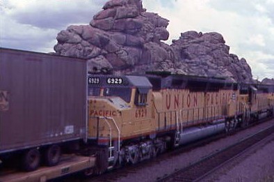 Union Pacific DD40AX 6929 passing the unique rocks found on the hill. We returned to Greeley, Colorado and beat the storms out of Wyoming.