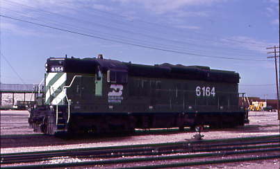 We stopped by the Burlington Northern yard in Cheyenne, catching Burlington Northern SD9 6164, nee Chicago, Burlington and Quincy 362, built by Electro-Motive Division in 1955. It later became BNSF 6164 then Port of Tillamook Bay 6164 in 2003, before being scrapped in 2012.