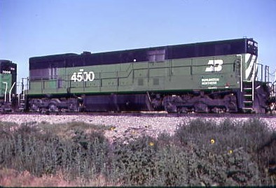 Behind him was Burlington Northern U30C 4500, nee Burlington Northern 5336, built by General Electric in 1972. It was wrecked at Cassa, Wyoming in July 1981, rebuilt at West Burlington, Iowa and numbered 800B, though it never wore that number. It was renumbered 4500 and was active until it was retired on February 11, 1987, cannibalized for parts at West Burlington on May 4, 1987, and sold to Precision National Corporation on November 11, 1987.