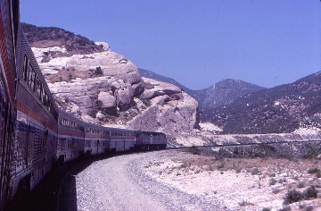 Minutes later, we crossed Highway 138 at grade before crossing Cajon Creek and running below the Mormon Rocks then curved to the east at the Davis Ranch to continue the climb under Interstate 15 over the old Highway 66 bridge, passed Alray siding and entered the Lower Tunnel. We briefly popped back into daylight before entering the Upper Tunnel then running east along the slope. The down, or south, track was very close as we turned to the south where we rejoined the other mainline before rounding a sweeping turn to the east through the deep cut to Summit.