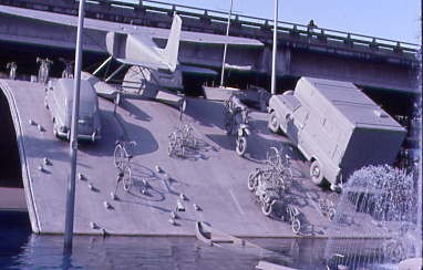 Beginning in False Creek, the 712 foot long Highway 86 rose out of the sea like a giant undulating serpent. The four lane boulevard was loaded with over 200 cars, boats, bicycles, space capsules, airplanes and lunar rovers. Uniformly grey, the surreal structure invited spectators to walk on the highway or use the vehicles for seating. The steel and concrete highway was a commentary on our love-hate relationship with technology in the 1980s. Highway 86 could have been interpreted as leading to either utopia or apocalypse, and because the structure rose from the sea, it could also be perceived as a humorous commentary on Darwin's Theory of Evolution.