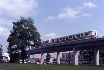Skytrain was unveiled just prior to Expo 86. Hailed as one of the most advanced rapid transit systems in the world, it was not surprising that part of the route straddled the fair. For fairgoers themselves, Skytrain was the> primary shuttle link between the Canada Pavilion on the North end of Downtown and the main site on the shores of False Creek.