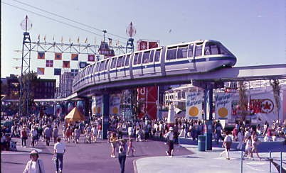 A view of the grounds with the Monorail running overhead. That was the only transportation system that touched every Zone and to allow as many rides as possible, passenger travel was restricted to half way around the 3.47 mile route. After the fair, the city originally planned to keep the monorail as a shuttle service between the beaches of English Bay and Downtown, but after much protest from the surrounding neighbourhoods (who feared that the monorail would make too much noise) the plan was scraped and the monorail was sold. It now shuttles people to and from the parking lot in Alton Towers Amusement Park, England.