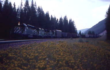 7/25/1986 It was a bright sunny morning as I awoke at Whitefish and its the Bavarian-style depot. We departed on time and proceeded down the double-tracked main line to Columbia Falls, the site of a large aluminium plant. The railroad turned into a single-track main line here as I made my way towards the lounge car where I found a seat on the right and was ready for Burlington Northern's crossing of Marias Pass. This was discovered in 1853 by Isaac Stevens, the first Governor of Washington Territory, who surveyed a route for a Northern Pacific Railroad and discovered a pass near the sources of Maria's River suitable for a railroad, estimated to be 2,500 feet lower than the south pass of Fremont. By modern measurements, Marias Pass is 2,337 feet lower. During the Survey of 1889, Marias Pass was finally explored and charted by John Frank Stevens, principal engineer of the Great Northern Railway and the location of the pass had been rumoured for decades beforehand, but it took Stevens and a Flathead guide named Coonsah, who had been hiding out with the Blackfoot in Browning, to discover it.