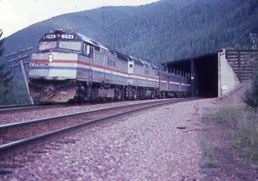 Back on single track, the train dove into a long tunnel under US 2 for the last time for a while and passed the tiny community of Pinnacle, where east of here, on a ledge, the railroad returned to double track. We passed the ballast pit where Burlington Northern was busy making a ballast train since the summer months are the time of heavy maintenance. Further east, we passed the yard at Essex, the helper terminal and then the Izaak Walton Inn, where I would be staying tonight. We rounded the corner and rolled past the Amtrak stop at Essex, one of the few flag stops on the Amtrak system, but since there were no passengers detraining or entraining, we continued on, rounded a curve and entered the first snowshed of the morning located high above the Middle Fork of the Flathead River.