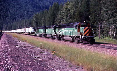 The peaks gave way to hills as the train started to descend the east side of Marias Pass which was quite tame compared to the west slope. The main difference is that you can see the whole range of peaks that makes up the summit of the Rockies. The peaks had glaciers on them, hence the name Glacier National Park, We rolled to the next siding at Bison to find Burlington Northern's hottest piggyback train cooling its heels waiting for us to pass. The foreground scenery was less impressive than the background scenery, which was awe-inspiring since the trees were stunted in their growth from the extremely powerful wind which comes off the mountains. We wound our way down to our next stop, the log cabin depot at East Glacier, built by the Great Northern, which was instrumental in not only bringing people to the park, but also taking care of them once they arrived.