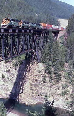 We passed over the Sheep Creek Trestle and across the river in the park was Goat Lick, a natural salt deposit, to which mountain goats are partial to, and of course, the Great Northern used a mountain goat as their mascot, naming him "Rocky". The double track ended at West Java and the tracks ran on a ledge high above the river protected by a slide detector fence since the mountain here is very unstable and could not take a double-tracked main line along its base. We passed through some trees then out onto the high bridge at Java over the Flathead River before we crossed over US Highway 2 with the railroad now becoming the southern boundary of Glacier National Park.