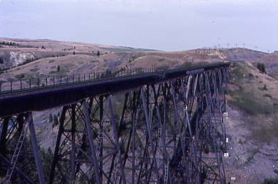 Leaving East Glacier, we crossed the Two Medicine River on a very high trestle before reaching the long siding at Grizzly, where we rolled by another freight. We were now in the low rolling hills when our crew came on the public address system and stated that that was it for the mountains today. A large sweeping curve brought us into Browning, but the train did not stop here at this time of year so we sped through then crossed another impressive trestle bridge before arriving at Cut Bank. We were now passing through ranch country with a few wheat farms scattered about and the scenery stayed this way until Havre.