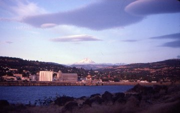 Across the river was Hood River, Oregon which afforded another good view of Mount Hood, after which we rounded the large bend in the river to our next stop at Bingen-White Salmon, then about twenty minutes east of there, we passed The Dalles Dam with its navigational locks along the shore and as luck had it, there was a boat being raised to continue its journey up the Columbia River. The dam itself had twenty-two generators and sent power to places as far away as Los Angeles. Further east at Wishram, we came to the Fallbridge wye with the railroad bridge over the Columbia River. This line was known as the Inside Gateway and was Great Northern's link to Northern California. James J. Hill, founder of the Great Northern, dreamt of having a line to California and this line became it.