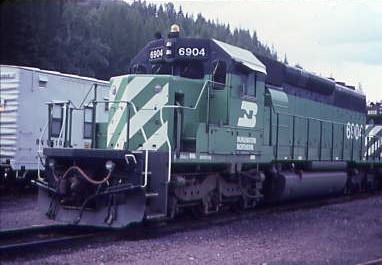 Burlington Northern SD40-2 6904, nee Burlington Northern 6368, built by Electro-Motive Division in 1973, was one of the helper units assigned here.