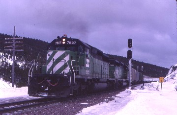 3/20/1989 After breakfast and watching Amtrak go through, Ron and I drove on Highway 2 east of Summit and another hike netted us the Empire Builder. We caught a westbound and followed it through Essex as we made our way toward Whitefish, where we found three trains on the way.