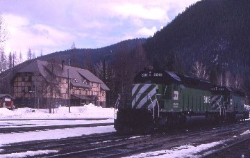 3/19/1989 Awakening on the Empire Builder this morning was interesting as one had to find where the lounge car's location was, now that the Spokane and Seattle sections of the train had been combined. It did not take too long and I enjoyed my breakfast. We were approaching Whitefish, a crew-change point and it had recently snowed here and was a picturesque winter scene. We departed on time as I was enjoying the Columbia Falls and onto Belton, also known as West Glacier. The canyon east of Belton was stunning and we passed two westbound freights between Nyack and Paola. I returned to my seat as the train went through Pinnacle and by the Essex crossovers, the conductor came to get me and we went downstairs, then passed the Izaak Walton Inn and stopped at the snow-covered platform, where I detrained.