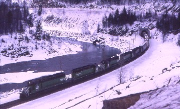 A westbound Burlington Northern freight. Once the snow stopped, I walked east and saw a freight on both sides of the snowshed near the hotel then enjoyed a nice morning walk that took me across the Goat Lick trestle to West Java.