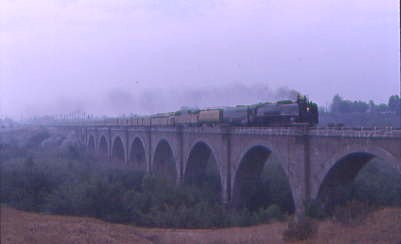 Southern Pacific 4449 East to West Colton 5/7/1989Southern Pacific 4449 was going to leave LAUPT at 5:00 PM to be situated in West Colton for tomorrow's side-by-side excursion over Cajon Pass with Union Pacific 8444. With the line running mainly west to east, Jeff and I needed to find a location with good lighting so I choose a spot in El Monte, which in a few years would become the location of the city's Metrolink station. About 5:20, here came the steam train off the flyover and en route to San Bernardino silhouetted against the late afternoon sun; a most impressive view.