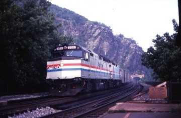 I had a reservation at the Hilltop House so asked a merchant which road would lead to the hotel and off I went up a steep hill lugging my bag. I checked in and received a room on the second floor overlooking the town and the junction of the Potomac and Shenandoah Rivers, the point where the three states of West Virginia, Maryland and Virginia meet; it was a fantastic view. I freshened up and went to explore the area then hiked across the bridge to the Maryland side and climbed the ridge with the railroad and river far below. I stayed there for two hours with nary a train so it appeared that my lucky streak was over. The view was still spectacular and across the valley was the Hillstop House in its white paint. I returned to the station and seeing the schedules for both MARC and Amtrak trains, thought that I would be able to photograph them if I had an early dinner, so returned to the hotel and ordered a Southern fried chicken dinner which was excellent and watched an eastbound CSX freight. Afterwards, I walked back down the hill and was rewarded with four trains, the first being a MARC commuter train pulled by one of their F-units.