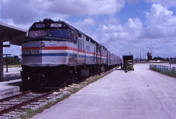 7/20/1990 The next morning, I awoke in Jacksonville, Florida and throughout the night, we crossed South Carolina and southeast Georgia. My room had no power so I surmised the crew must be cutting out the Tampa section, so I pulled the shade down to fall back asleep and did not re-awaken until Ocala and the Florida version of forest. I began to see citrus groves as we approached the junction of the Tampa line, onto which we curved east but then turned south a few miles later at Auburndale. We stopped at Winterhaven and half an hour later at Sebring then went by the eastern edge of Lake Okeechobee and with every crossing, I looked for alligators. After bridging four waterways, I finally saw a group sunning themselves on the bank of the channel. My existing impression of Florida was that it was all swamps and water, not the more rolling forested lands to the north so this was something I learned. From Okeechobee to West Palm Beach, we raced along 57 without a curve, although there was a large section of 79 miles last night from Hamlet, North Carolina to past Lugoff in South Carolina. After miles of scrub pines and swamps, the train returned to the urban environment and stopped at West Palm Beach, Delray Beach, Fort Lauderdale and Hollywood. We passed the CSX yard, Amtrak's Hialeah maintenance facility before arriving at Miami Station, ending my ride on the Silver Star.