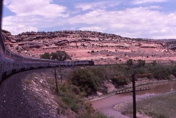 I went back to my room for my camera then went downstairs to open the window and photograph the train, the canyon and the incredible beauty of this place. Upon exiting Ruby Canyon through a tunnel, I decided to go to the dining car for lunch before we arrived at Grand Junction, our next servicing stop, then detrained during our ten minute stop to see if Bob, whom I had met on the Rio Grande Zephyr in 1983, was still working the baggage room. I was told that Bob was in Denver working the baggage room and thought that maybe I would run into him there. I reboarded, but the train sat for another fifteen minutes waiting for a Rio Grande freight to clear, allowing our departure on a clear signal. The train passed through De Beque Canyon, meeting our westbound counterpart at De Beque siding, then we continued through Rifle to our next station stop of Glenwood Springs, where I returned to the lounge car for a river- side seat prior to our arrival.