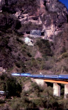 We entered the Le Pera Tunnel and curved around the 180 degree turn, putting us onto the top level with the outstanding view of Temoris below then passed through the next tunnel that went between the monuments, and entered the tunnel-after-tunnel section. I made one last call for outdoor bar service and my passengers cleaned me out so the outdoor vending was most successful. I returned with an empty ice cooler to the lounge car, finding my two regulars waiting for me so I served them and Bill joined us for the first time today and we talked railroading.
