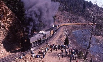 The above from the April 1991 issue of "The Ferroequinologist", the monthly newsletter of the Central Coast Chapter of the National Railway Historical Society.We departed Portola twenty-three minutes late but no one cared as the excitement of the trip was in all of us and I was starting to live a dream. We proceeded west past the museum and out into the valley to Mabie, before passing through the tight canyon then the canyon dropped below us and we crossed Willow Creek on the famous Clio Viaduct, 172 feet above the stream. We continued west to Blairsdan where the pacers in their cars were waiting for us on Highway 70. Along the Middle Fork of the Feather River, we travelled through Two Rivers to Sloat, where we met an eastbound Union Pacific freight train then proceed to Milepost MP 299.8, the site of our first photo runby of the day.