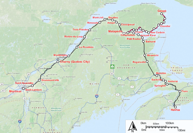 Leaving Amqui, we crossed Amqui River and a few minutes later, passed Lac-au-Saumon, the first lake of this new morning before arriving at Causapscal. Outside of town, I spotted a covered bridge, the first of three that we passed in this forest then we came upon our last stop in this province, Matapedia, which is a major junction since the Canadian National line to Gaspé leaves the main line here, and is the route of VIA Rail's Chaleur. Additionally, the other junction is of the Matapedia and Restigouche Rivers into Chaleur Bay, the body of water that leads to the Atlantic Ocean.