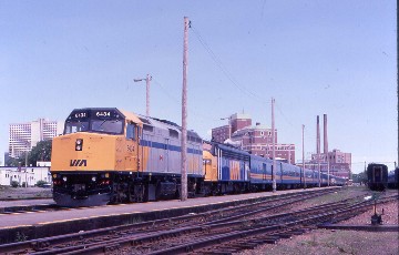 The Canadian VIA 2 6/26/1991This transcontinental passenger train is operated by VIA Rail with service between Union Station in Toronto, Ontario and Pacific Central Station in Vancouver, British Columbia. Canadian Pacific introduced this service on April 24, 1955, serving Montreal, Toronto and Vancouver. In 1978, Via Rail Canada acquired the service and, on January 15, 1990, designated the Canadian as its sole transcontinental service between Toronto and Vancouver. The new service replaced the former Super Continental, Canadian National's flagship passenger service and continues to run primarily over CN tracks.
