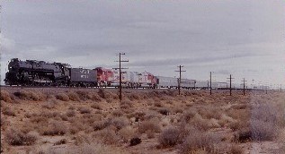 The train curved off the huge wye and out onto the Mojave River bridge where the steam engine slowly began to accelerate with great stack talk. My view from the dome was fantastic as I was really enjoying the engine puttting on a show. We crossed Highway 58 where we came upon most of the chasers for this morning's segment to Mojave, and crossed the road with everyone waving. We passed the small town of Hinkley with most of the townspeople watching our train pass through. From here, we climbed the short grade to Jim Grey siding, a place from which I once watched trains, then closed in on the highway and at Four Corners, crossed Highway 395 with many curious onlookers, who must have not known we were coming through. Our tracks made a beeline to Boron, passing underneath Highway 58 east of town then we passed the old red Boron depot before reaching the switch for the industrial trackage located to the north of the highway. To our south was Edwards Air Force Base, a vast expanse of High Desert with a huge dry lake bed that the space shuttle had used for its landings. Our pacers were doing a great job of staying with us as we made our way to Silt before descending down a short grade and a slight climb to Edwards, where a photo runby was held.