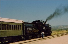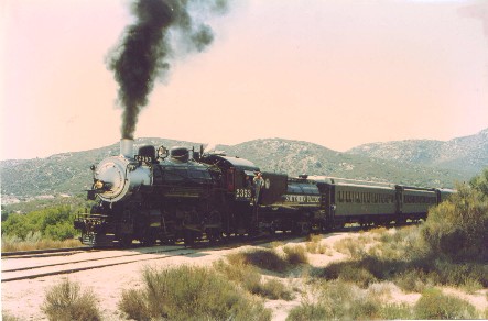 Southern Pacific 2353 9/21/1996After that fantastic visit, Jeff and I drove about an hour southeast to Campo, where we spotted Southern Pacific 2353 steaming away as we approached. Since I had just rejoined the museum as a member, our excursion behind this newly-restored locomotive was complimentary. I was surprised to find Bill Wallace, owner of Bananafish Tours, here and we discussed his next Copper Canyon excursion in December.