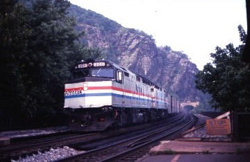 8/16/1996 Awakening east of Pittsburgh to old deserted buildings of the steel industry, I went to the dining car for a breakfast of French Toast and sausage followed by a visit to a nearly-deserted lounge car. During the night, we lost an hour but with a two-and-a-half-hour window between this train's arrival and my next departure in Washington, DC, I was not worried. We also had travelled over a new section of mileage between Cleveland and Pittsburgh. I chose my favourite seat in the Superliner Lounge car for this morning's ride over the former Baltimore and Ohio Sand Patch grade across the Appalachian Mountains. The most noticeable difference from my first trip in 1990 was where I was sitting since then, I was in the front seat of the dome car looking out over the train. Today, I was in the lounge car looking straight out of a side window. In the dome seat, I saw the tunnels as we approached them but now I had to anticipate where they were, which made it a little more interesting. We passed through the forest and small town America which line the Youghiogheny River of Pennsylvania to the valley of the Casselman River at Confluence, which we would follow to Rockwood Tunnel at the summit of Sand Patch Grade.