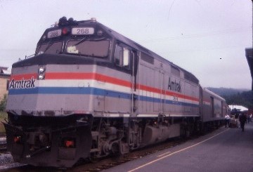 The Adirondack 69 8/23/1996As I quickly walked to this train, I noticed the coaches were of Santa Fe vintage that had been used in Clocker Service, which, when built, had 44 seats but now had 80. The consist also included an Amdinette car and the train was being pulled by a new P32AC-DM built by General Electric. I boarded and chose a seat on the right, foregoing the Hudson River for the journey's later scenic highlight of Lake Champlain. I stored my bags in the overhead luggage rack and stretched out in my coach seat which had less leg space than on an Amfleet coach but with a much larger window. When the train started to move, the ride quality took over and I would describe it as smooth.