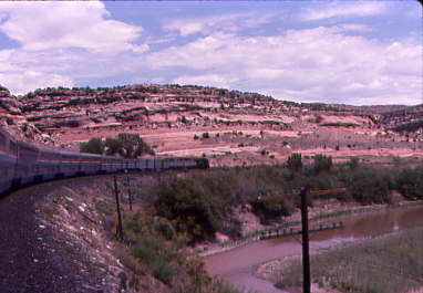 A few ranchers live here but most of the ranching is done by truck. The canyon walls stood tall and the river ran wide. In the middle of Ruby siding, up on the canyon wall, is a painted line that is the state line of Utah and Colorado. But with anything that is good, it was over too soon as we plunged into a tunnel and left Ruby Canyon behind for the Grand Valley. Grand Junction was next and I was off the train to the hobby shop to buy some railroad magazines. I have always liked this town for some reason and am not sure if it was the friendly people, the view or the climate, or maybe all three, but to me, it is a nice place. Passengers were buying fruit at the fruit stand, a unique characteristic of this station then with the train serviced, the smokers satisfied and our new passengers boarded, the engineer blew the whistle and we were off to continue our eastward journey.