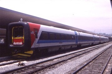 North American TourThe Flexliner train was in their paint scheme of red, white and blue and consisted of two sets of three articulated cars. The first control car had 16 first class seats, a kitchen compartment and 20 second class seats. The middle car of each set had 64 second class seats and the rear control unit had 44 second class seats as built. For its North American Tour, the seating was changed to 32 first class seats and 109 second class seats. Power for the cars was provided by an auxiliary power unit located under each car and the cars had large windows centered between the seats which reclined slightly.