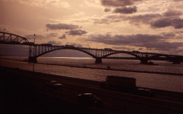 Maple Leaf 63 10/16/1997We departed New York City on time and proceeded up the Westside Connection on a dark and overcast morning, stopping at Spuyten Duyvil due to a reverse commute Metro-North train. There was a colourful view across the Hudson River if only the lighting would improve. I went to the lounge car where I helped clean up a mess that a leaking coffee maker had made then showed the attendant, Bruce, how to elevate his stock to keep it dry in the future. I had helped Linda Paul, the Lead Service Attendant, on the San Diegan, several times with this problem and wondered if it could be the same car.