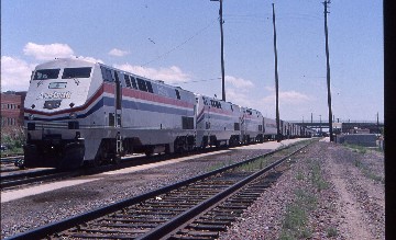 6/13/1997 The next morning, I was off to the lounge car for a breakfast of tea and chocolate chip cookies while I watched the Northern Arizona scenery west of Seligman. It was a beautiful bright morning as the train climbed towards the Arizona Divide then at Williams, I saw the Grand Canyon Railway's steam engine being prepared for its run to the South Rim of the Grand Canyon. We arrived at Flagstaff on time and I picked up a copy of USA Today which made me a very popular person in the coach. Just before crossing Canyon Diablo, I returned to my book and spent most of the rest of the day reading and glancing out of the window every so often. I had never read a book that I could not put down and this was the first Grisham novel I had read, given to me by Peter Televik, a Lead Service Attendant on the San Diegan line.