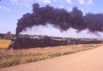Milwaukee Road 261 Day 2 9/12/1998For the first 24.3 miles of today's journey, the train would follow the same route as the California Zephyr as far as Ashland, which allowed 261 to stretch her legs while doing the only seventy-miles-an-hour sprint during the three-day trip. 261 pulled the train effortlessly as the miles to Ashland passed quickly before we made our passenger stop there, then we turned north onto the Sioux City Subdivision for the 109.3 mile ride to our next watering stop at Sioux City.