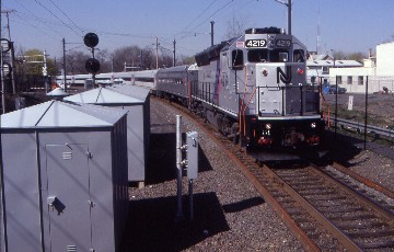 Northeast Direct 95 The Old Dominion 4/13/1998I was finally going see the section of rail from Boston to New Haven in daylight, as my only other time over that section was on the Night Owl. In addition, it would give an opportunity to see the progress of the electrification project on the last diesel-hauled portion of the North East Corridor. The Old Dominion departed twelve minutes late and the timetable and books stated it was only a mile to Back Bay station, but I disagreed. The train then made the quick sprint to Route 128 station, passing several T commuter trains. I noted that in some places, the poles were up and in others, either just the foundations were in the ground or were waiting to be installed. The train crossed the Canton Viaduct and entered Rhode Island, then a few minutes later, the Capitol building of that state came into view prior to our stop at Providence.