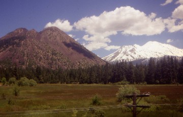 We climbed out of the canyon with a fantastic view looking down then past the site where a boulder came from the top of the canyon and rolled all the way down to the river, pushing everything out of its way. This took us to Mott siding, where we met Southern Pacific's RoadRailers I-5 train, which travelled from Seattle to Los Angeles, followed by Azalea. We continued to Mount Shasta City with great views of Mount Shasta but no action on the McCloud River Railroad.