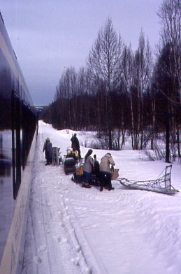 We were met by snowmobiles pulling sleds to pick a family up from the train. Conductor Steve dropped off newspapers for people who live along the route.