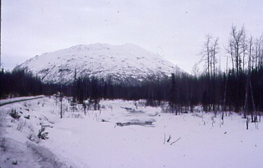 It also marked the completion of the Alaska Railroad in 1923 and the Golden Spike was driven by President Warren Harding on July 25, 1923. Mount McKinley could be clearly seen in the distance and further north at Dunbar at Milepost 43.6, a -70 degree Farenheit temperature was once recorded. The train passed through the low hills with Taiga trees abounding then at Saulich, we encountered a track grade problem where a culvert was still frozen and the water was seeping through the fill, causing our train to gingerly creep across this section of track.