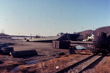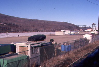 The Aurora had now reached Nenana, Milepost 411.7, on the banks of the Tanana River, where grounded barges wait for the spring thaw.