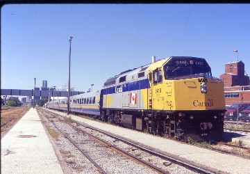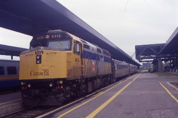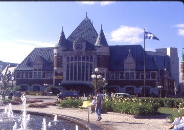 VIA 34 8/11/1999I boarded the exact same trainset to Montreal that I had ridden from Toronto and this way, VIA does not have to turn trainsets in Ottawa. We departed on schedule, travelling down Canadian National's Alexandria Subdivision, which they still own as far as Milepost 72, while VIA owns the rest of the way to Coteau Junction. Near Alexandria, the countryside became more rolling in nature before it flattened out again then at Glen Robinson, Train 35 was in the siding on its way to Ottawa. Next it was our train's turn to be stopped at Coteau Junction to wait for a Canadian National freight to clear on its Kingston Subdivision, the same one we left at Brockville. When we entered that line, it ended my new mileage for now. We rode the very eastern end of the Kingston Subdivision to Dorval before running the final miles on Canadian National's Montreal Subdivision to Central Station then prior to the crossing of the Ottawa River, the train announcements switched to French first then English, as is the custom in Quebec. We arrived eight minutes early at Montreal and had an excellent view of Mt. Royal and the downtown skyline upon approach and I went up into the station to a deli for a plain roast beef sandwich and was surprised by the cheese roll which I really liked. I started the boarding line for the Chaleur to Gaspé.